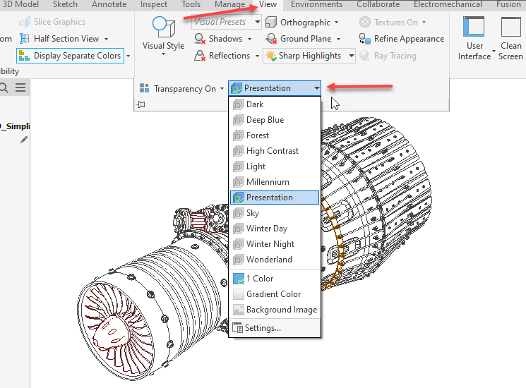 In the part, assembly, and presentation environments, you can now temporarily override the color scheme and background color. Go to the View tab, expand Appearance, and select the desired color scheme and background color type.