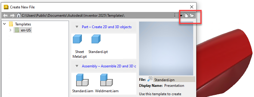 Access to templates files in now easier using the Create New File dialog. The following two options are added to the top right corner: