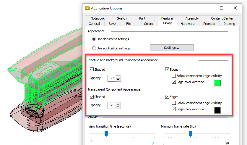 Transparent components now render with edges by default, making them visually distinct from inactive components when viewed in the canvas. The visual style for both inactive and transparent components can be customized independently on the Display tab of the Application Options. Specify the options in the Inactive and Background Component Appearance and Transparent Component Appearance areas of the dialog.