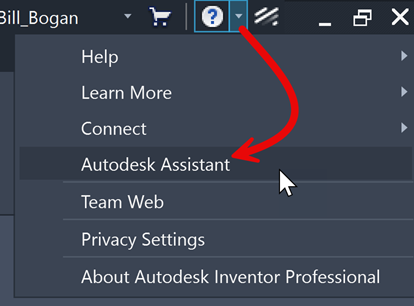 At the top of the Inventor window, on the right side of the Application bar, click Autodesk Assistant.