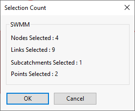 For SWMM networks, this dialog shows the number of nodes, links, subcatchments and points included in the current selection.