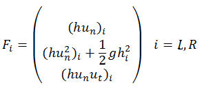 where the first two terms represent the exact flux calculation, and the last term is a numerical viscosity which vanishes if the hydraulic variables in the adjacent elements are the same. The exact fluxes are given by the following generic expression: