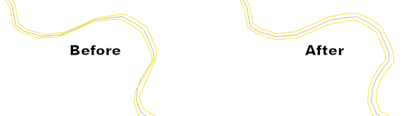 When using the Create bank lines from section ends option, and you chose to follow the shape of the river reach link, the software now tries to project the banks out from the link line in a way that provides more natural looking bank curves whilst minimising the number of vertices used. A before and after example is shown below: