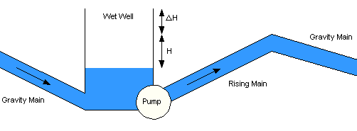The head across the pump includes the difference between the wet level in the wet well and the water level at the top of the rising main (H). It also includes any friction losses in the rising main itself (ΔH). This is demonstrated in the diagram below.