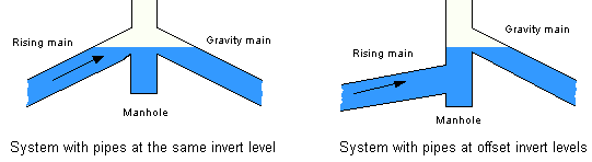 Another reason the pressurised pipe model may not be implemented is if the top of the rising main is not completely full, as shown in the diagram below left.