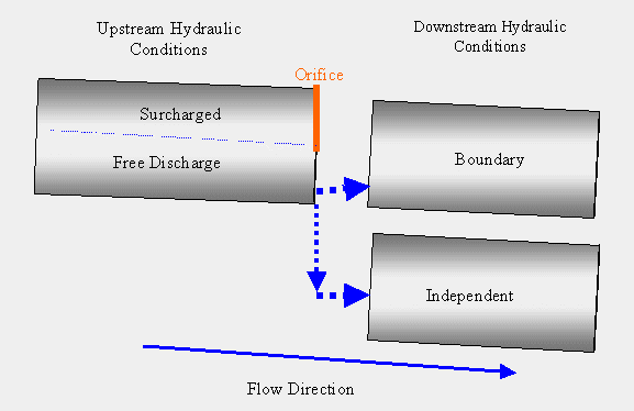 Figure 1 shows the up and downstream conditions. If the water level upstream of the orifice is below the soffit of the orifice, it is described as free discharge. If it is above the soffit, it is described as surcharged. If the water level downstream of the orifice is below the invert, it is described as independent. If it is above the invert it is described as a boundary condition.