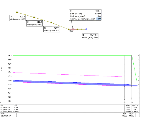 Figure 9 shows the same network as Figure 7. Here the flow rate upstream has been increased so that the orifice is surcharged upstream.