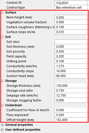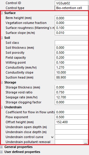*The individual parameters which define each part of a bio-retention cell are described in the SUDS Control Data Fields and LID Control Data Fields (SWMM).
