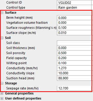 *The individual parameters which describe each part of a rain garden are described in the SUDS Control Data Fields and LID Control Data Fields (SWMM).