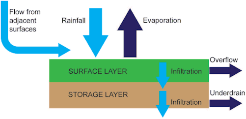 The following diagram illustrates how a rain garden is modelled in InfoWorks ICM: