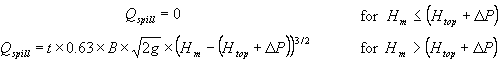 Where: Qspill = spill discharge, m3/s B = conceptual spill width, m Hm = water level in the manhole, m Htop = ground level in the manhole, m ΔP= buffer pressure level for the spill, m g = acceleration due to gravity m/s2 t = relative weir coefficient, linear scaling coefficient for the spill |