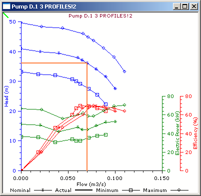 Mechanical power values are also defined in the Head Discharge Table allowing the calculation of an efficiency curve and electric power curve that can be viewed on a graph when analysing pump operation (see below).