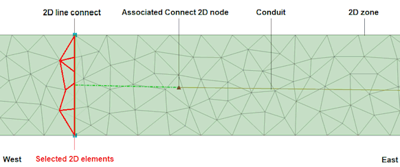 The 2D line connect object can be located anywhere in the same 2D zone as the associated node, and when the 2D zone is meshed, the 2D line connect object is intersected by the 2D mesh, and an intersection length is assigned to each intersected 2D element.