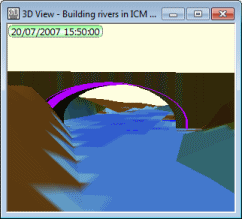 Improved display of bridge openingsIn InfoWorks ICM v1.1, bridge faces were drawn solidly in the 3D Network Window. In this version, a hole is now cut into the face of the bridge to display the bridge opening clearly. Improved display of 2D mesh elements2D mesh element ground levels and water levels are now drawn as horizontal elements separated by 'risers'. This approach provides a more accurate representation of the 2D mesh levels as used by the simulation engine and of the simulation results produced. In addition, gaps in the display of the 3D view due to the previously used method of drawing water levels are eliminated. |