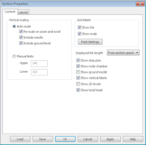 This dialog lets you customise the content and layout of the section displayed in the Long Section Window , the Cross Section Window or the Section Window.