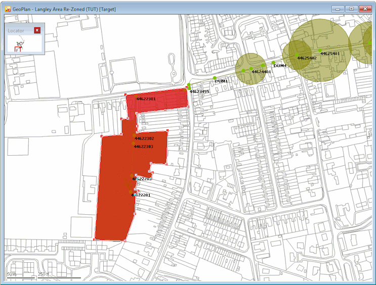 - Zoom in closer, so that you can clearly see the housing estate to the south of the node '44622301'. You can, for example, use the Find in GeoPlan option in the GeoPlan menu to zoom to the node. In the dialog, enter the node id, in this case, 44622301, and click the Find button, and the GeoPlan will be centred on the specified node.