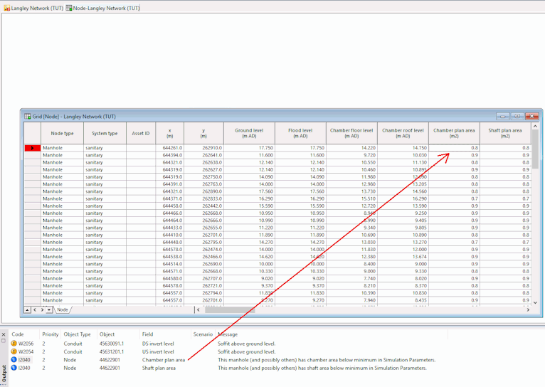 - Correct the Warning messages. The warnings indicate that the soffit level for two connected conduits would be above the ground level of the shared node.