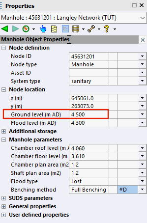 - Select the upstream node (45631201). The Ground level is shown as 4.3 m AD (which is below the soffit level).