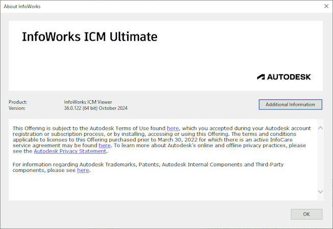 An example of the About InfoWorks box when using the Autodesk InfoWorks ICM Viewer.