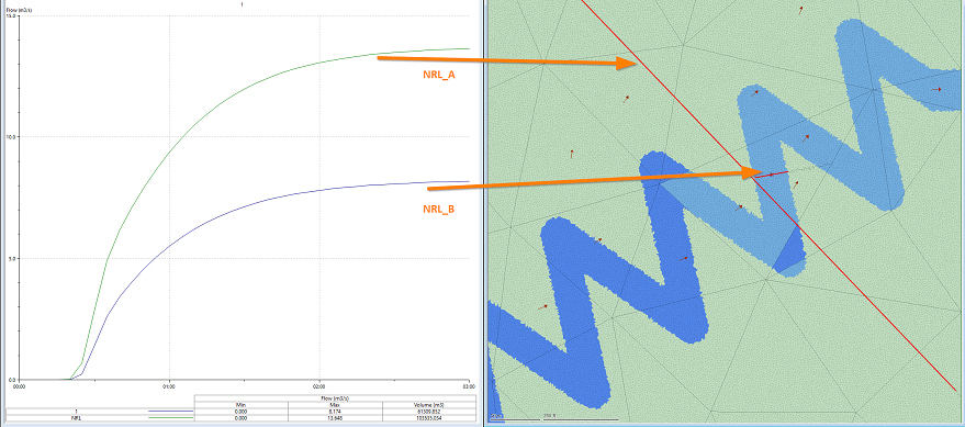 In this example, the expected flow through the river bed is 13.5m3/s. This is captured correctly when using a network results line (2D) covering all the 2D elements that transfer flow downstream (see NRL_A and the green graph line in the example). However, the smaller network results line (2D) that is drawn only on the river bed (NRL_B) does not fully capture the total flow (as shown by the purple graph line). This is because the size of the subgrid 2D elements is too large with respect to the river bed and flow "tunneling" occurs in the meander where this line (NRL_B) is located.