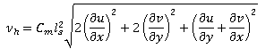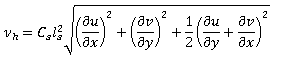 where: vh is horizontal eddy viscosity (m2/s) Cm is the mixed length coefficient ls = min (0.267 kh, kdw) is characteristic turbulent length scale (m) u is velocity in the x coordinate (m/s) v is velocity in the y coordinate (m/s) |