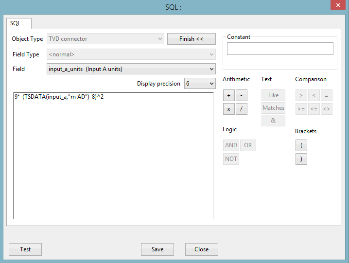 An SQL expression can be added to a TVD connector, allowing time series data in the TSD object to be transformed into a value which is appropriate for your model. For example, you may use an expression to apply a rating curve or fill in missing data in the data stream (overriding the usual priority order of the three input data streams). Any SQL expressions will be automatically evaluated during an appropriate Run.