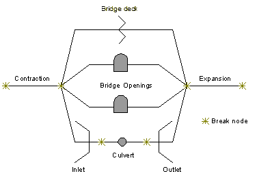 The contraction reach from upstream end of link (full width upstream) to upstream bridge face and expansion reach from downstream bridge face to downstream end of link (full width downstream) are modelled in a similar way to river reaches, with additional support for ineffective flow areas and contraction and expansion losses.
