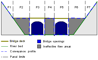 InfoWorks ICM determines the ineffective flow areas from bridge opening geometry. For example, a single opening bridge will have two ineffective flow areas: one from the left bank to the left of the bridge opening, and one from the right of the bridge opening to the right bank.