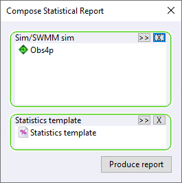This dialog allows you to select the simulations to be used in the production of a Statistical Report and to select the Statistics Template on which the report is to be based. The dialog is displayed when you drag a Statistics Results item into the InfoWorks ICM workspace or select Statistical reports from the Results menu.