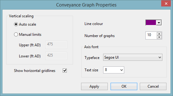 The Conveyance Graph Properties dialog enables you to change the display of the conveyance graph. The window is displayed by right-clicking on the graph displayed in the Conveyance Graph Window, and selecting Properties from the popup menu.