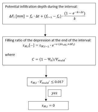 If the filling ratio of the previous interval is zero, then the filling ratio of the current interval can also be set to zero. Otherwise, the filling ratio of the depression is related to the potential infiltration depth and the evaporation depth available for emptying the depressions. Due to the exponential approach of the depression filling ratio, the depression never becomes mathematically empty. Therefore, the filling ratio at the end of the current interval (εM,i) is set to zero when the calculated filling ratio multiplied by the reduced depression loss is lower than 0.01, as shown in the following steps: