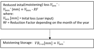 The term, moistening storage, is used to describe the amount of water required to fully moistened the ground surface at each time step. Within a continuous simulation, the recovery of the moistening storage due to evaporation needs to be taken into account. The steps for calculating rainfall minus moistening storage are shown below: