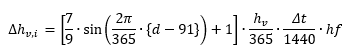 Where: ∆hv,i = depth of evaporation at interval i hv = average yearly evaporation depth (user input) [mm] d = current day of the year at the time step (e.g. 1st January = 1) (No special rules for leap years) ΔRi is the rainfall minus initial (moistening) and infiltration loss (mm ∆t = duration of the time interval in minutes hf = hourly factor depending on the current hour at the time step given in the following table*: