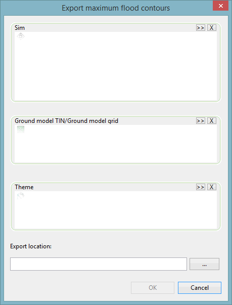 In order to export the maximum flood contour data, InfoWorks ICM requires you to specify one or more simulations, a ground model and a theme, which contain elevation and contour interval information, as well as the location of the folder where the files are to be exported to. The names of the exported files are automatically given the same names as the simulations with the appropriate file extensions. Any existing files in the 'export' folder, which have the same file name and extension as the ones currently being exported, will be automatically overwritten during the export operation.