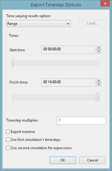 - Range - export results at multiple timesteps. Select the range of times for which results will be exported using the Start Time and Finish Time controls. Results for timesteps at the interval specified in the Timestep multiplier field will be exported within the selected range.