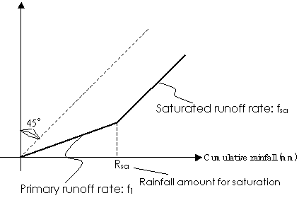 In the f1-Rsa method, an initial runoff rate, f1, is applied until the cumulative rainfall reaches a specified saturated rainfall value. A second runoff rate, fsa, is then applied.