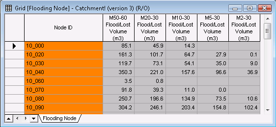 The Flood Volume Report identifies the nodes that would be flooded in particular circumstances. The report lists the nodes in the first column. There is one additional column for each simulation included in the report.