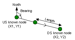 - Both an upstream and a downstream node were found, and at least one of the located nodes is adjacent in the network to the current node. Compute the bearing between the nodes of known position, and then compute the position of the unknown node based on this bearing and connected conduit length. If both upstream and downstream nodes are adjacent, the downstream conduit length is used in the calculation by default. If neither connected conduit length is known, the node is placed midway between the nodes of known position.