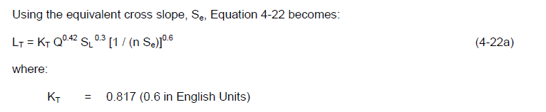 LT is calculated as: ![]() ![]() ![]() ![]() ![]() In the calculations for continuous curb openings, the simulation engine does not have access to the values of SL and n, but it does know the values of Q, T and Sx. By re-arranging 4-2 to get an expression in terms of SL and n, we can substitute this into 4-22a to determine LT.
