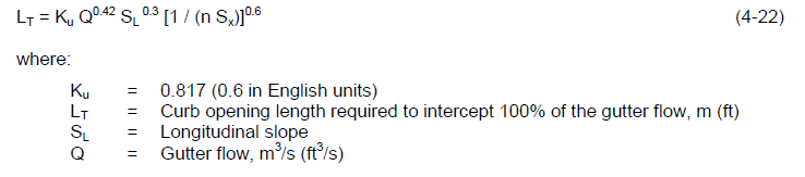 where: L = curb opening length, m (ft) LT = length of curb opening inlet required for total interception of gutter flow, m (ft)