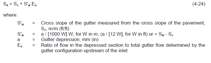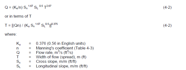 where: Ku = 0.0828 (0.15 imperial units) V = velocity of flow in gutter, m/s (ft/s) Sx = road cross slope, m/m (ft/ft) L = length of the grate, m (ft)
