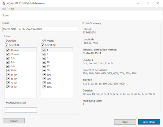 Data type | The type of storm data (depth or intensity) to be included in the generated storm. |