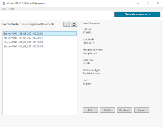 Generate a new storm | Opens the Rainfall data page, allowing you to specify the required parameters for the NOAA storm to be generated. |