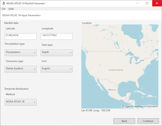 This page is initially displayed when the NOAA ATLAS 14 Rainfall Generator button is selected from the Rainfall Generator dialog.