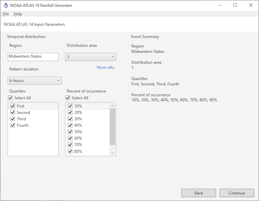 This page is displayed when you click Continue on the Rainfall data page, and have selected NOAA ATLAS 14, NRCS Regional, Huff Distribution or Bulletin 75 as the method of distribution. It is used to specify the temporal distribution parameters for the storm.