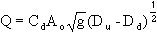 where Q - discharge (m3/s) Cd - discharge coefficient Ao - orifice cross sectional area (m2) g - acceleration due to gravity (m/s2) Du - upstream depth above invert (m) Dd - downstream depth above invert (m) |