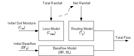 The loss model is based on the Probability Distributed Model (PDM). Effective rainfall is evaluated sequentially during a storm and if soil storage is filled, runoff will equal 100%.