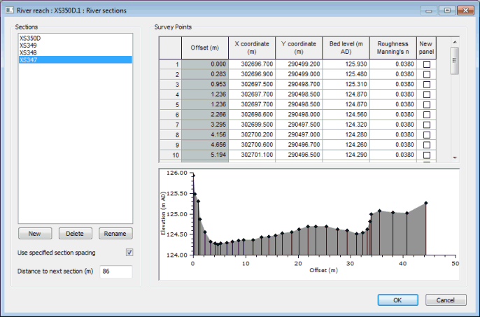 - Click on a section in the list and click Delete to remove the section from the river reach.