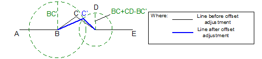 For line ABCDE, a new offset is specified for vertex C (shown as C'). The position of C' is calculated by finding the point that is distance BC' from vertex B and BC+CD-BC' from vertex D.