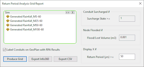 - Produce an RPA report for a series of simulations using rainfall of different know return periods and storm durations.